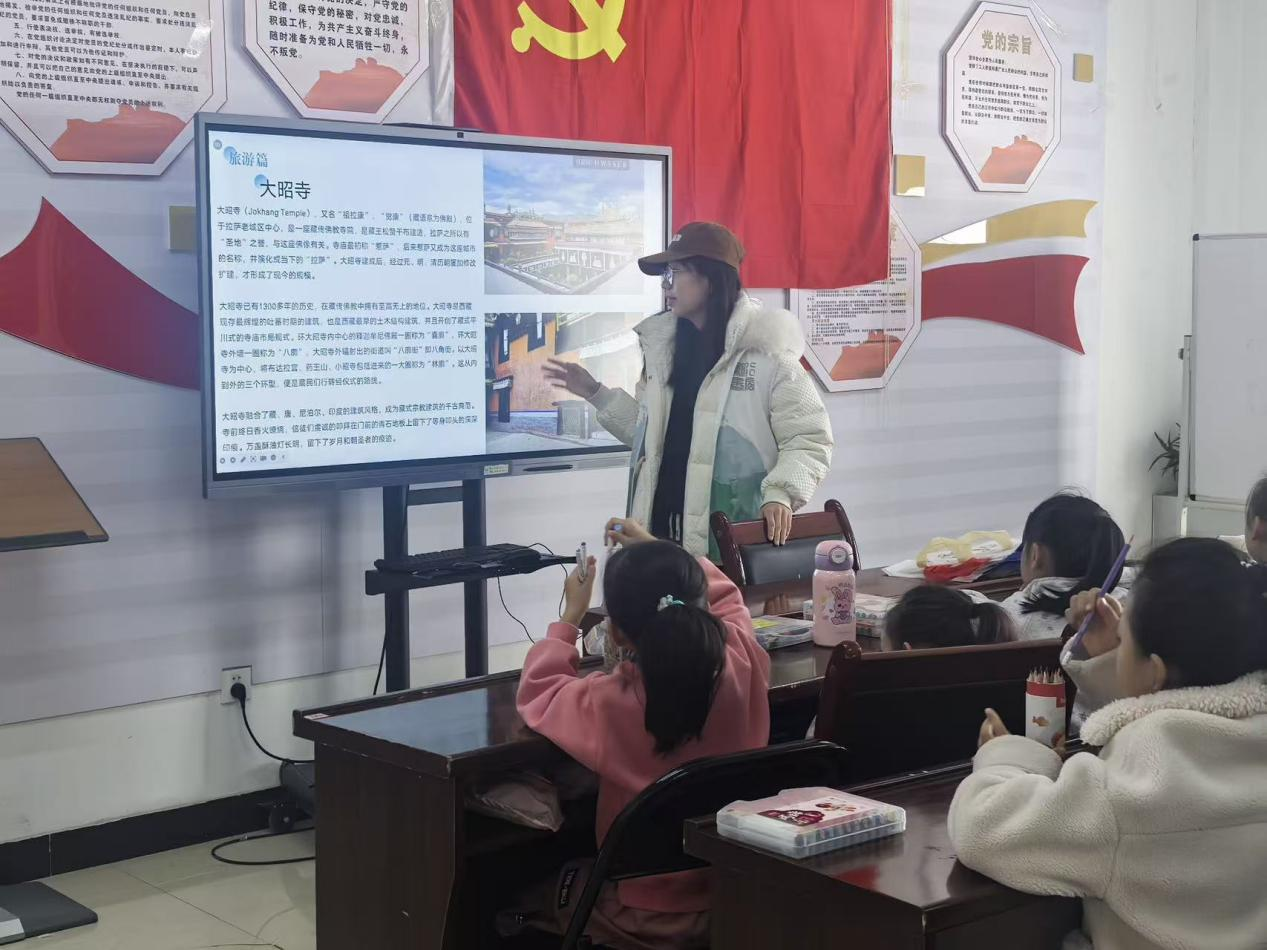 志愿者利用演示文稿展示了西藏的地理特征、民俗文化和自然风光,介绍了高原生态环境的脆弱性。志愿者与社区儿童互动问答,小朋友们积极参与。