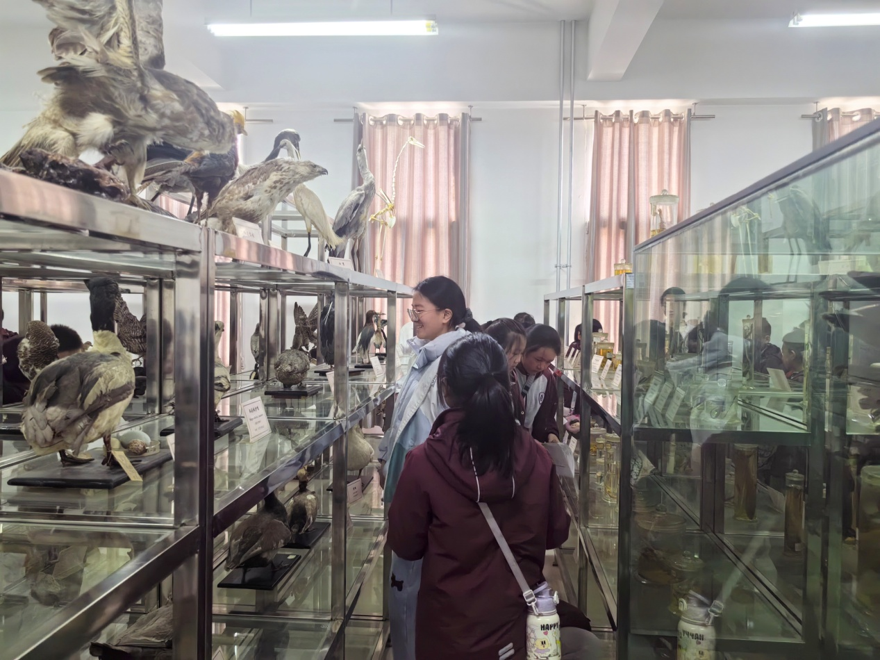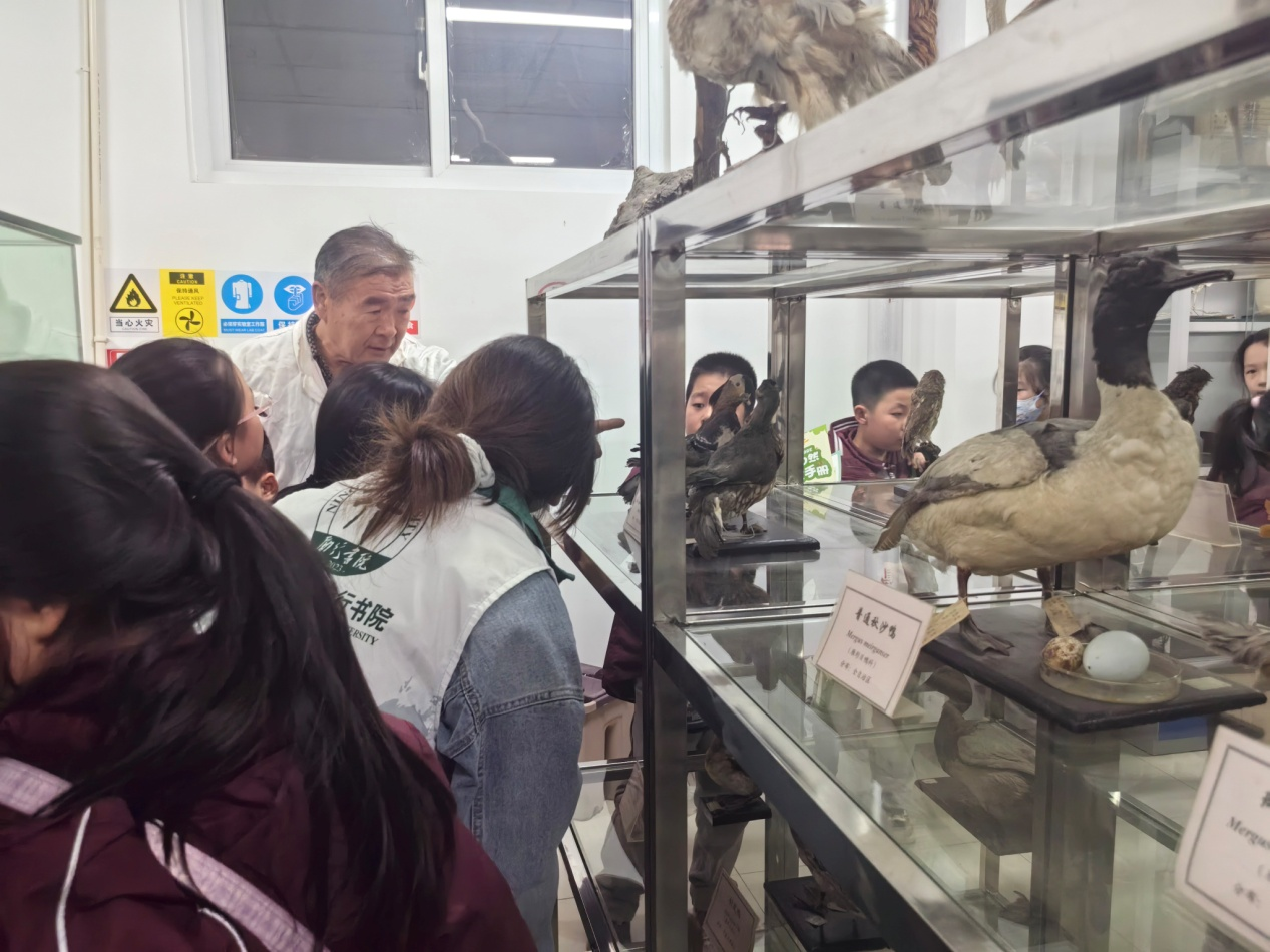 志愿者组织小学生们进入生物标本实验室,讲解生物知识,指引他们观察动物标本、主动提问交流,激发科学思维与对知识的求知欲。小学生们在校园内按线索寻找目标植物,观察特征并记录观察结果。志愿者帮助他们掌握基本的植物观察方法,感受自然的多样性。