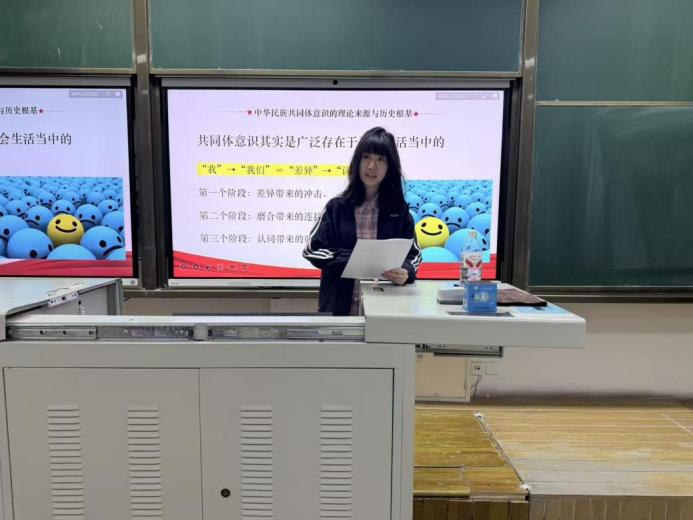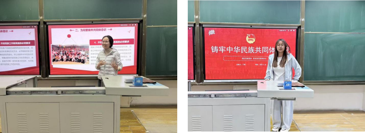 谢雨珊、王雨欣、丁悦围绕铸牢中华民族共同体意识的理论逻辑与实践进路进行了专题分享,系统阐释了其核心内涵与实践方向,从多个维度解读了核心要义,明确了青年的使命与行动路径,并围绕民族团结的相关维度展开阐述。