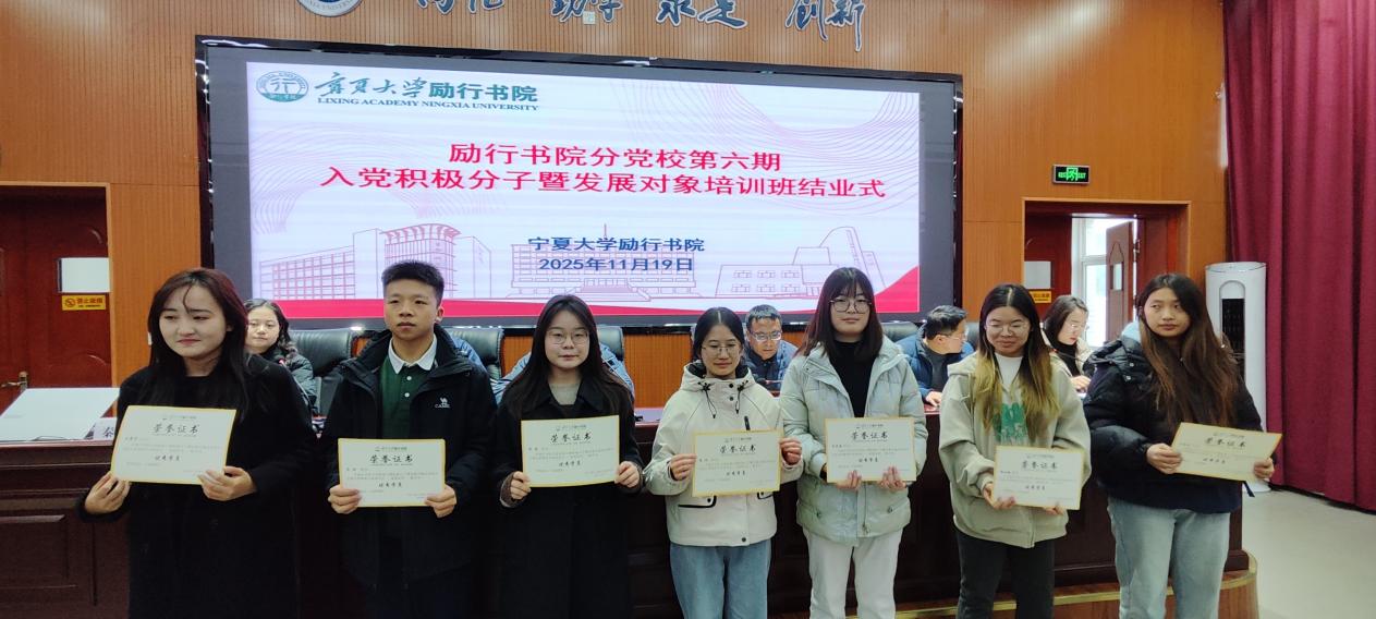 淬火砺初心,百炼成钢终有所获;笃行担使命,奋楫扬帆再启新程。11月19日,宁夏大学励行书院分党校第六期入党积极分子暨发展对象培训班结业仪式在知行楼三阶报告厅圆满举行。书院党委书记、院长张强、党委副书记马亮、党委副书记王兵、党委委员、副院长马生忠,党委委员、副院长王娜出席,党建思政中心教师秦玉琦和全体培训班积极分子、发展对象参加仪式,结业仪式由秦玉琦主持。