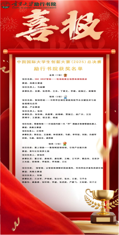10 月 13 日至 15 日,中国国际大学生创新大赛(2025)总决赛在郑州大学圆满收官。励行书院学子凭借过硬的创新素养与扎实的项目功底奋勇拼搏,最终斩获金奖1项、银奖2项、铜奖2项的优异成绩,在国际舞台上展现了书院学子的青春风采。